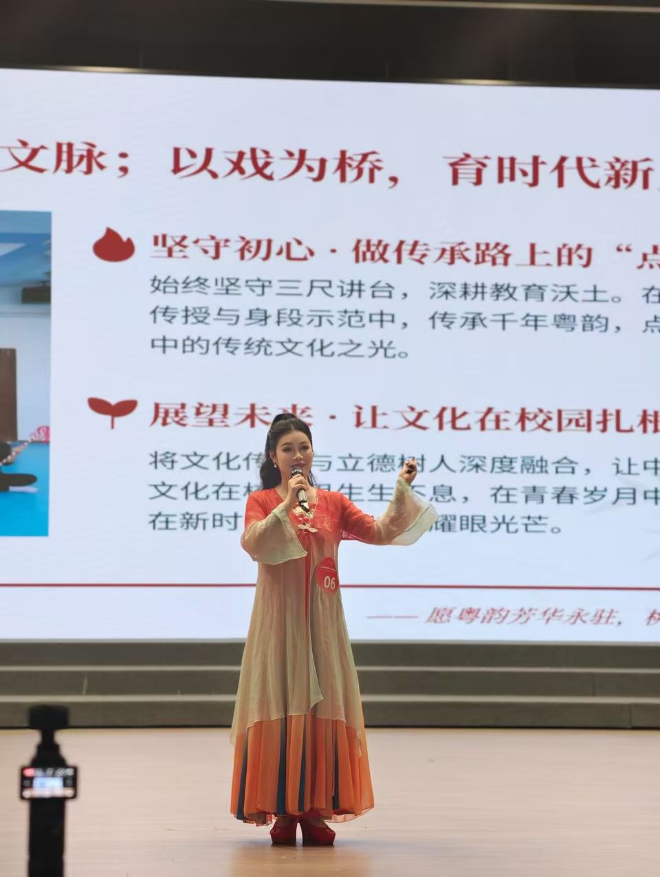 附属职校李焕焕老师作为省中职学校唯一代表以扎根职业教育一线的亲身经历,讲述了以粤剧这一岭南非遗艺术为育人载体,用爱心浇灌学生成长、以责任守护教育初心的感人故事,生动展现了新时代职教教师“以艺载道、美育润心”的责任与担当。